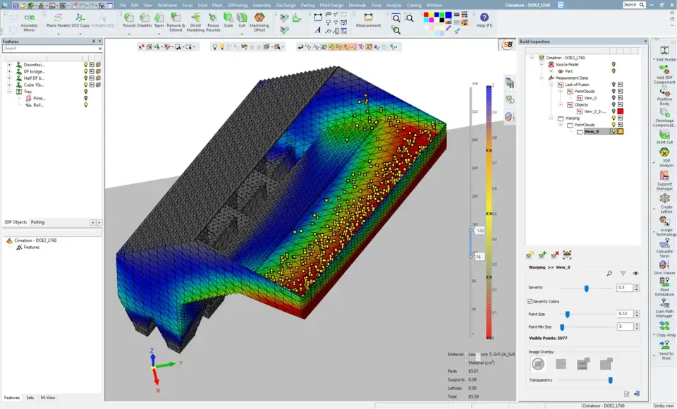 Nuestro equipo de científicos e ingenieros de materiales y procesos desarrolló algoritmos que muestran un alto nivel de correlación con los resultados de las tomografías computarizadas, lo que permite una detección automatizada, posterior a la impresión, de los incidentes. En un estudio, se verificó una correlación del 100 % de los resultados del análisis de DMP Inspection con la falta de fusión (LoF) encontrada en los datos de tomografías computarizadas para defectos >200 μm para una variedad de prueba representativa de piezas en LaserForm Ti Gr23 (A) y acero martensítico (A) impresas en la impresora 3D de metal DMP 320.